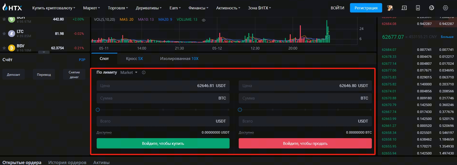 Войдите в свой аккаунт на официальном сайте HTX, нажмите Торговля на навигационной панели и выберите Спотовая торговля, чтобы подготовиться к Спотовой торговле. Выберите желаемую торговую пару, выберите торговую область покупки/продажи, выберите тип ордера (например, Лимитный, Рыночный, TP/SL или Триггер ордер), введите или сдвиньте ползунок для ввода количества и цены. Затем вы можете подтвердить ордер, нажав кнопку Купить/Продать.