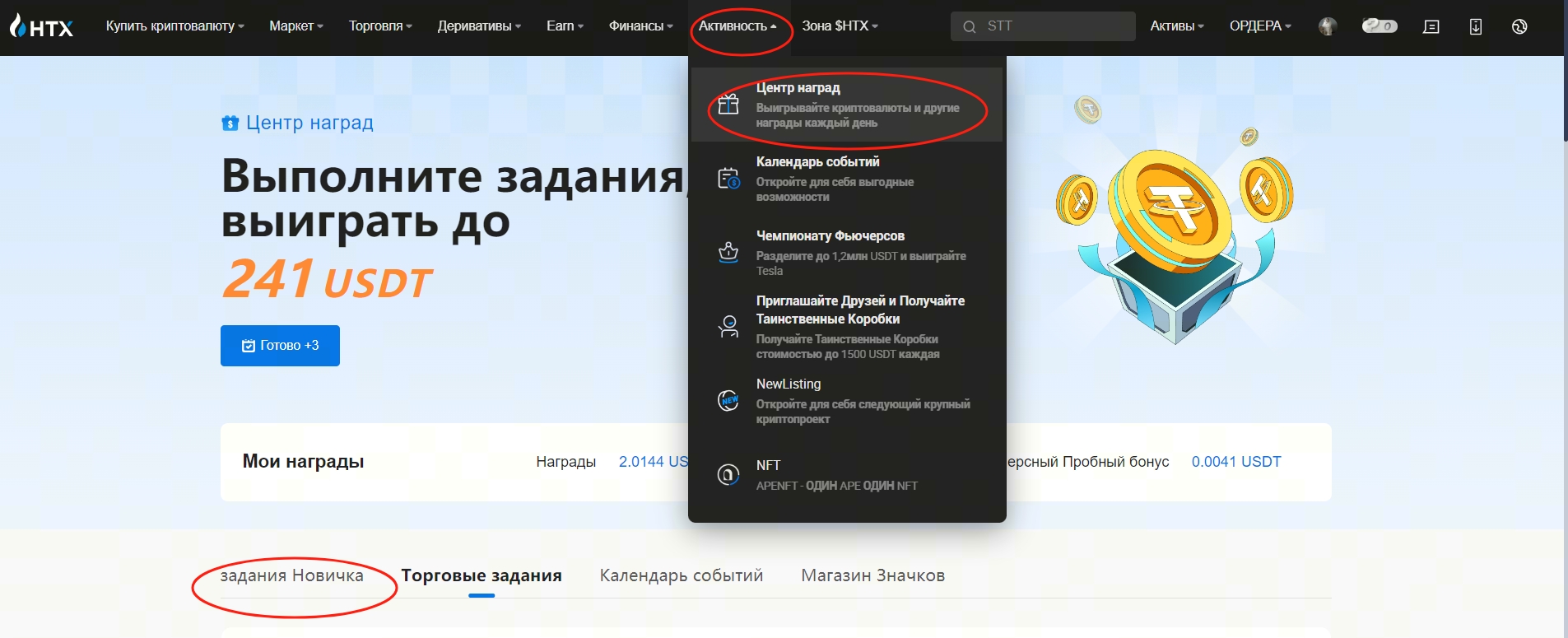 Специальное примечание: Награды за выполнение Заданий Новичка включают фиксированные вознаграждения и розыгрыши призов, общая сумма которых составляет до 241 USDT. Чтобы получить все награды, убедитесь, что вы выполнили все шаги в соответствии с руководством.