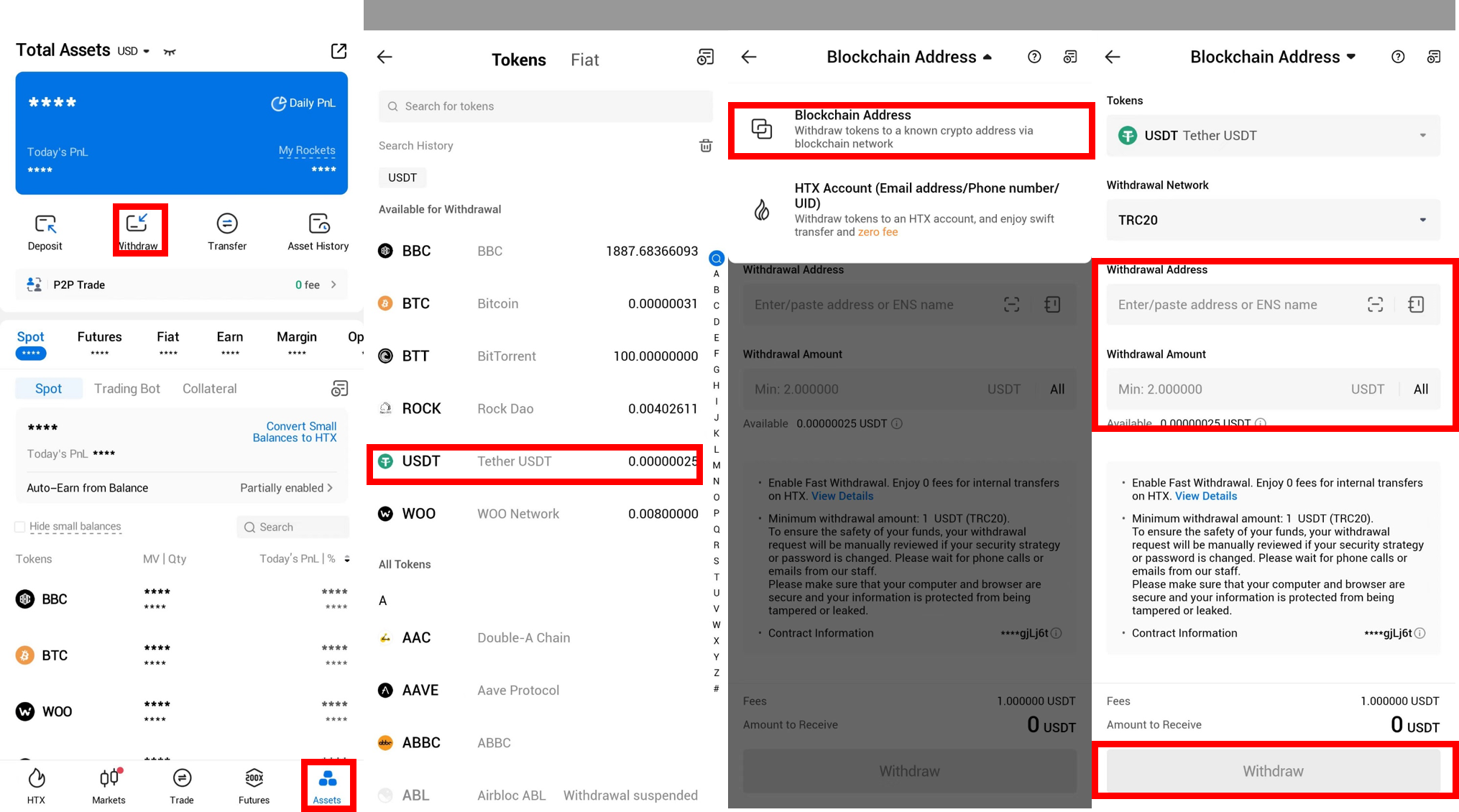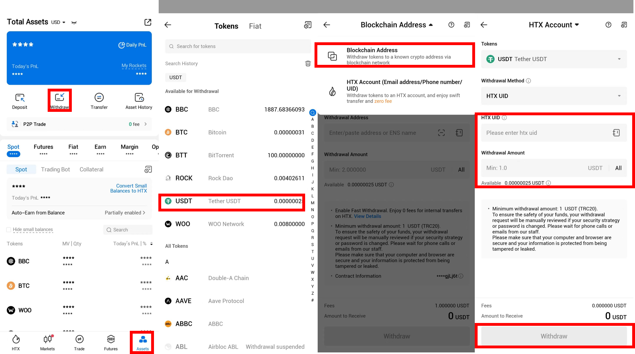 Если пользователи хотят вывести средства через блокчейн-адрес или аккаунт HTX, они могут войти в приложение HTX и следовать приведённым ниже инструкциям для вывода средств (используя USDT в качестве примера):