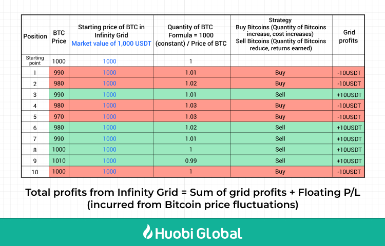 Инвестор держит некоторое количество BTC по рыночной стоимости 1000 USDT до запуска бота Infinity Grid. Он устанавливает прибыль на сетку в 1%. Когда цена поднимется до первой сетки, текущая стоимость BTC увеличится до 1010 USDT, и бот продаст BTC на сумму 10 USDT. Хотя количество BTC на руках сократилось, его стоимость в USDT постоянно поддерживается на уровне 1000 USDT, поскольку рынок имеет тенденцию к росту. Точно так же, когда рынок падает, бот будет покупать больше BTC, чтобы сохранить общую стоимость BTC на уровне 1000 USDT.