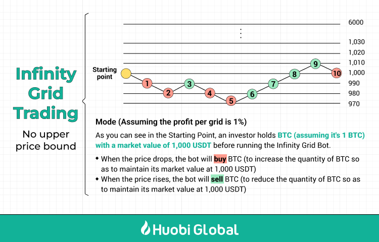 Бот Infinity Grid — это улучшенная версия Торгового бота Грид. Разработанный для использования преимуществ бычьего рынка, так что пользователям не нужно беспокоиться об упущенных инвестиционных возможностях, когда цены выходят за верхний предел цены. Бот Infinity Grid продает на росте и откупает падения в режиме 24/7. На бычьем рынке он фиксирует прибыль и сохраняет ваши инвестиции на постоянном уровне. К примеру, для пары BTC/USDT, по мере роста цены биткоина бот будет постоянно продавать BTC, при этом гарантируя, что имеющийся в распоряжении BTC сохраняет свою эквивалентную начальную стоимость в USDT.