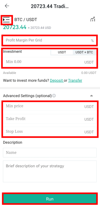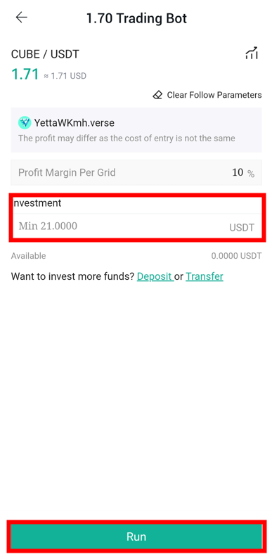 ● Инвестиции: Сумма, которую вы планируете инвестировать. Существует минимальная сумма инвестиций, связанная с установленной прибылью на сетку, из-за требования к минимальному объему торговли для каждого токена.