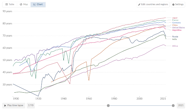 我们看到了什么?在过去的一个世纪里,取得了真正巨大的进步。这一点适用于整个世界,无论是历史上富有和主导的地区,还是贫穷和被剥削的地区。