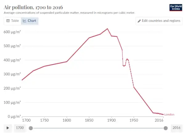 事实证明,1952 年甚至不是空气污染的高峰:在 19 世纪晚期,更高浓度的空气污染物甚至被认为是正常和可接受的。从那时以来,我们见证了空气污染在一个世纪内持续而迅速的下降。我亲身经历过这个过程,2014 年访问中国时,空气中充满高浓度的烟雾,估计寿命将因此缩短五年以上也属于正常现象,但到了 2020 年,空气往往看起来和许多西方城市一样清洁。这并不是我们唯一的成功故事。在世界许多地方,森林面积正在增加。酸雨危机正在改善。臭氧层几十年来一直在恢复。