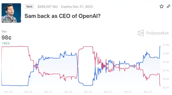 我也是预测市场的粉丝,它可以在事态尚未明朗、尚未就事态的发展方向达成共识之前实时揭示事件的重要性。比如,关于 Sam Altman 的 Polymarket 在逐小时的事件揭示和谈判中提供了非常有用的摘要,为那些只看到单个新闻项目而不了解每个项目的重要性的人提供了非常必要的背景。