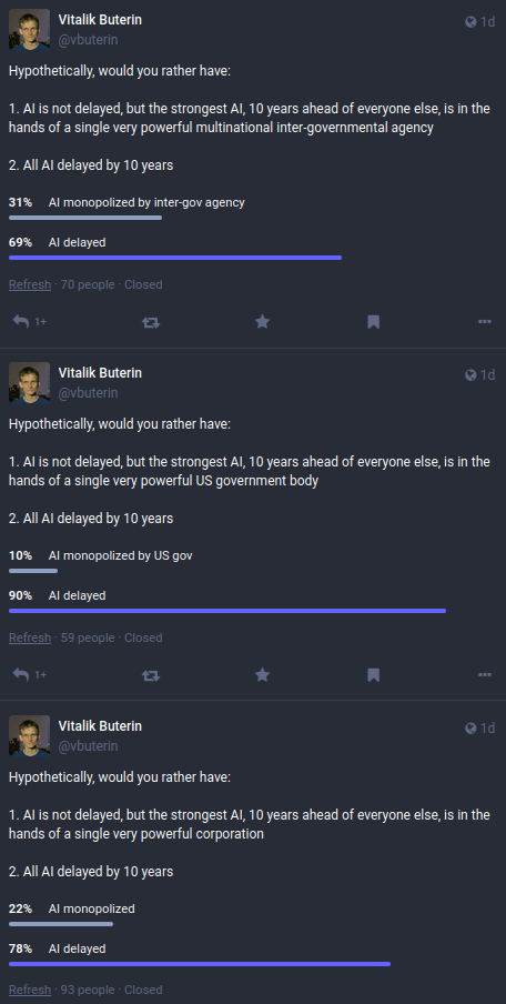 目前我看到的主要实际问题是,人们似乎并不真正信任任何具体的治理机制拥有建造这样一个东西的权力。当你看看我最近在 Twitter 上的投票结果时,人们被问及是否希望看到人工智能被一个提前十年起步的单一实体垄断,还是让所有人的人工智能延迟十年,这一事实变得非常明显: