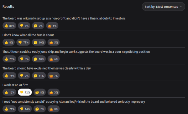 另一方面,我看到了需要思考如何降低这些风险的新方法。OpenAI 的治理结构就是一个很好的例子:它似乎是一个出于善意的努力,旨在平衡为了满足提供初始资本的投资者而需要盈利的需求,同时又希望通过设立一种制衡机制来抵制那些可能使 OpenAI 毁灭世界的举动。然而,在实践中,他们最近试图解雇 Sam Altman 的尝试使这一结构看起来像是一个彻底的失败:它将权力集中在一个不民主、不负责任的五人董事会中,他们基于秘密信息做出关键决定,并拒绝在受到威胁之前提供有关推理的任何详细信息。不知何故,非营利董事会表现得如此糟糕,以至于公司的员工创建了一个即兴的事实上的工会支持亿万富翁 CEO 而不是他们。