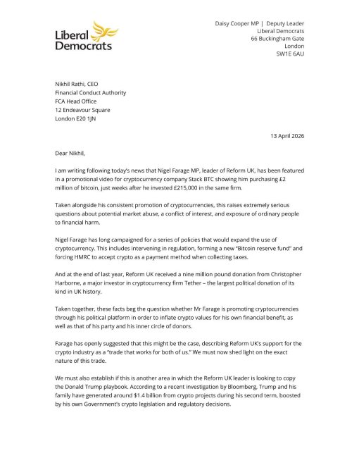 В понедельник заместитель лидера британских либерал-демократов Дейзи Купер попросила генерального директора Управления финансового надзора (FCA) Нихила Рати расследовать связи лидера партии Reform UK и члена парламента (MP) Найджела Фараджа с криптоиндустрией.