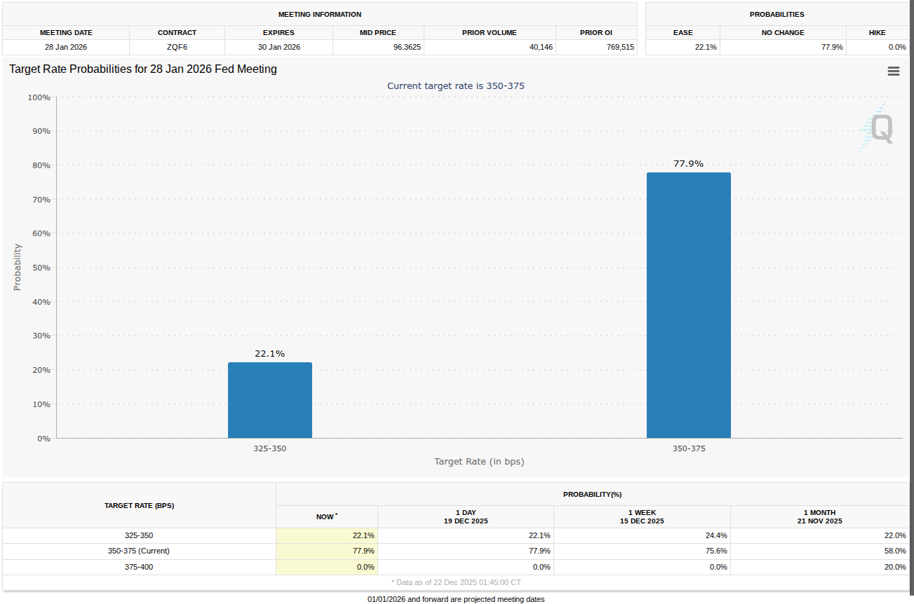 When it comes to the good times continuing, market sentiment remains skeptical. Data from CME Group’s FedWatch Tool currently puts the odds of the Fed cutting rates again in January at just 22%.