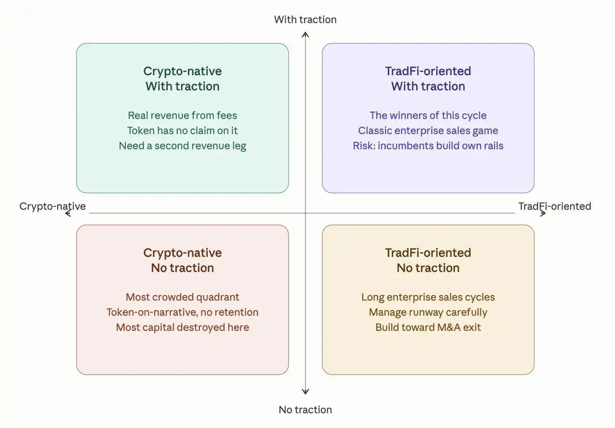 Sitting on the investor side this year, I found that almost every crypto founder I met can be classified into one of four categories. The two axes are simple: crypto-native vs. traditional finance-oriented, with traction vs. without traction. Four quadrants, covering about 75% of the market.