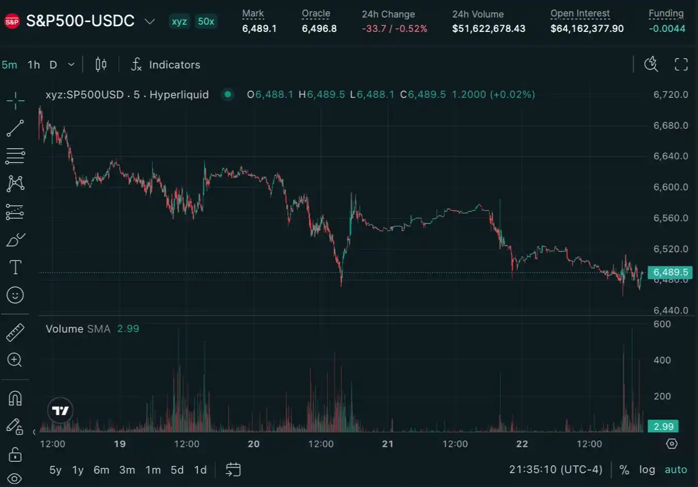 Then, on Saturday at 7:44 PM Eastern Time, Trump escalated his threats, warning that he would strike Iran's power facilities if the Strait of Hormuz was not reopened. The reaction was instantaneous: the S&P 500 on Hyperliquid immediately fell.
