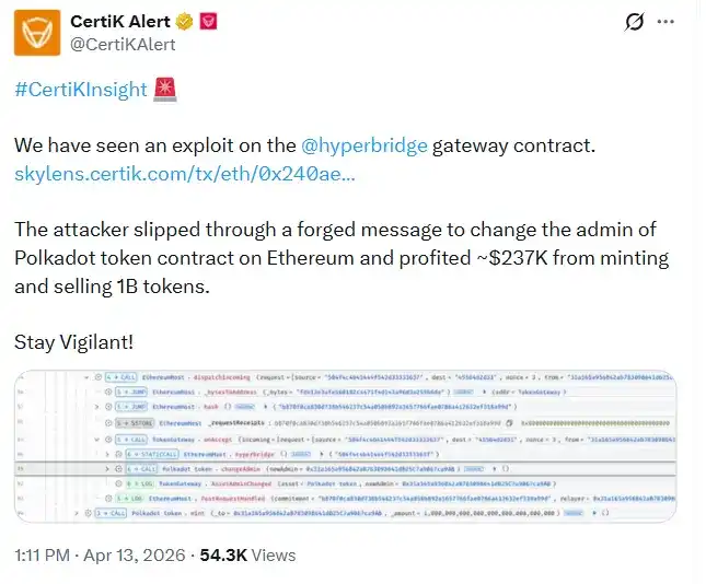 On the morning of April 13th Beijing time, on-chain monitoring platforms issued alerts one after another: abnormal issuance of Polkadot bridged assets was detected on the Ethereum network.