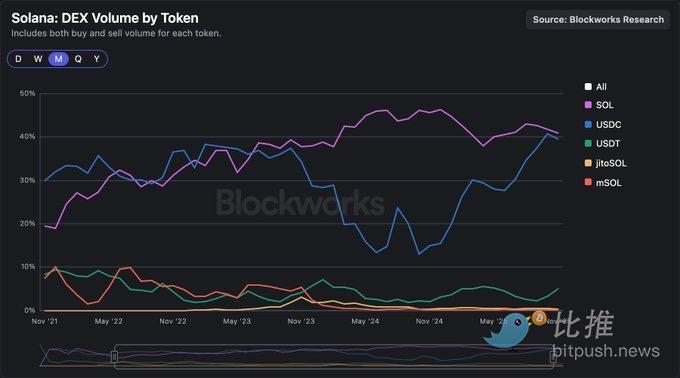 • SOL remains the primary medium of exchange and the highest volume asset on Solana (but USDC is catching up). This is mainly because platforms like Pumpfun and Raydium tend to use SOL as the quote currency, while other platforms (like Meteora) have a mixed situation.