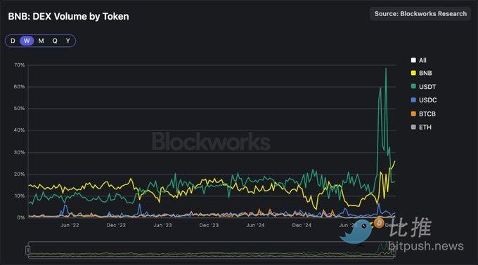 • From 2021 to 2022, BNB absolutely dominated the role of medium of exchange, but then USDT gained market share and surpassed BNB.
