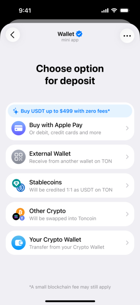 - Crypto deposits from BTC, ETH, and SOL, which are automatically converted into Toncoin upon arrival in TON Wallet