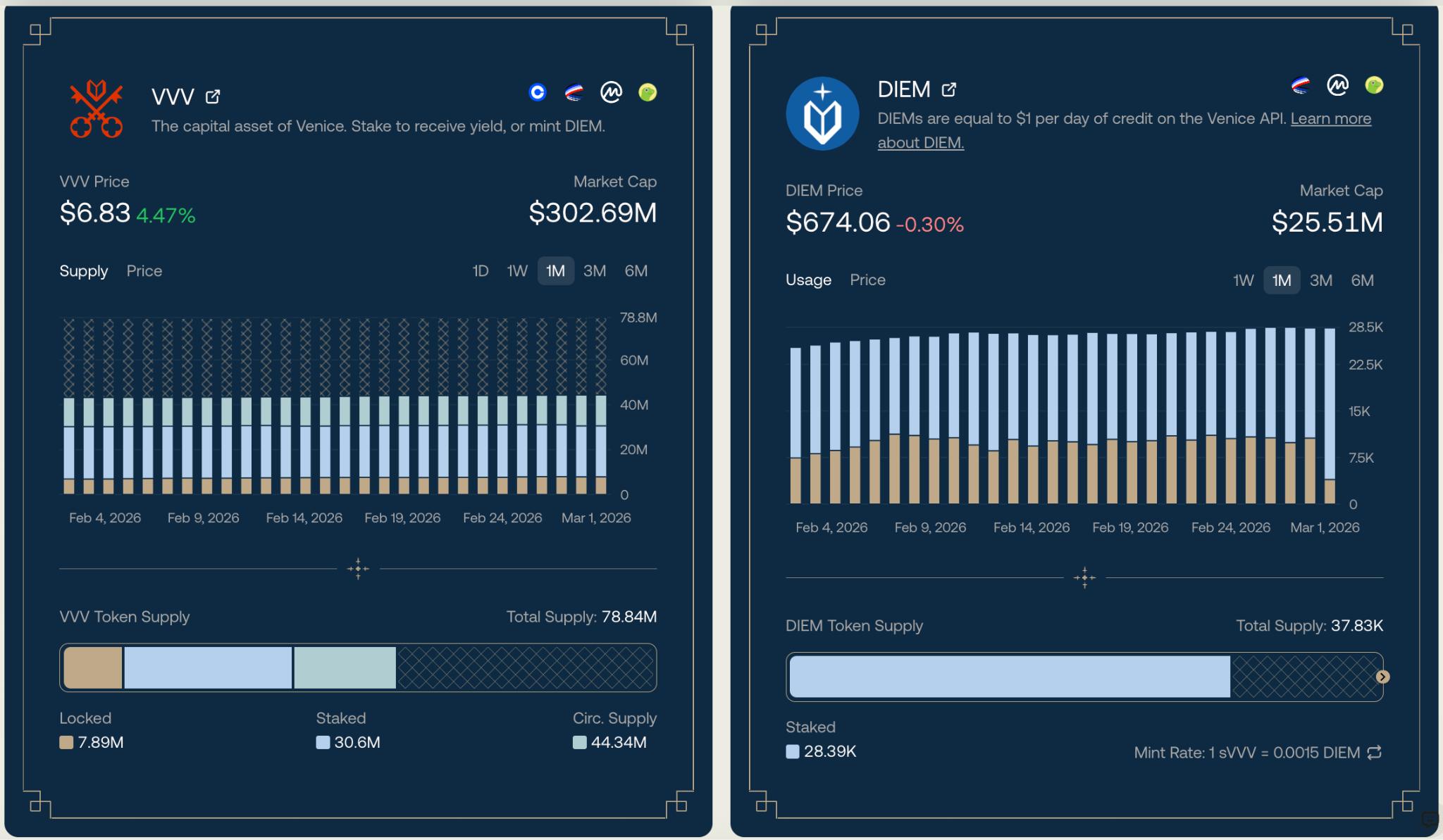 Within the Venice ecosystem, there are two core tokens: VVV and DIEM. They are tightly bound through a "one-way minting + reversible redemption" mechanism, forming a two-tier economic structure.