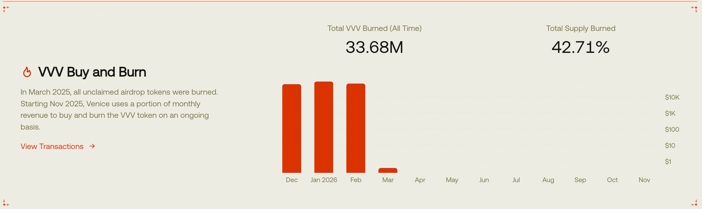 Starting in October 2025, Venice announced a reduction of the original emission plan from 10 million VVV/year to 8 million VVV/year. Simultaneously, it launched a monthly revenue buyback + burn mechanism. The current monthly burn capacity is 30,000 to 50,000 tokens, worth approximately $60,000 to $90,000. Currently, 42.71% of the token supply has been burned. Then, in early February 2026, the official announced another emission reduction plan, cutting from 8 million VVV/year to 6 million VVV/year. This series of adjustments directly changed the supply expectations. Looking at the token price performance, this was also the starting point for VVV's rise.