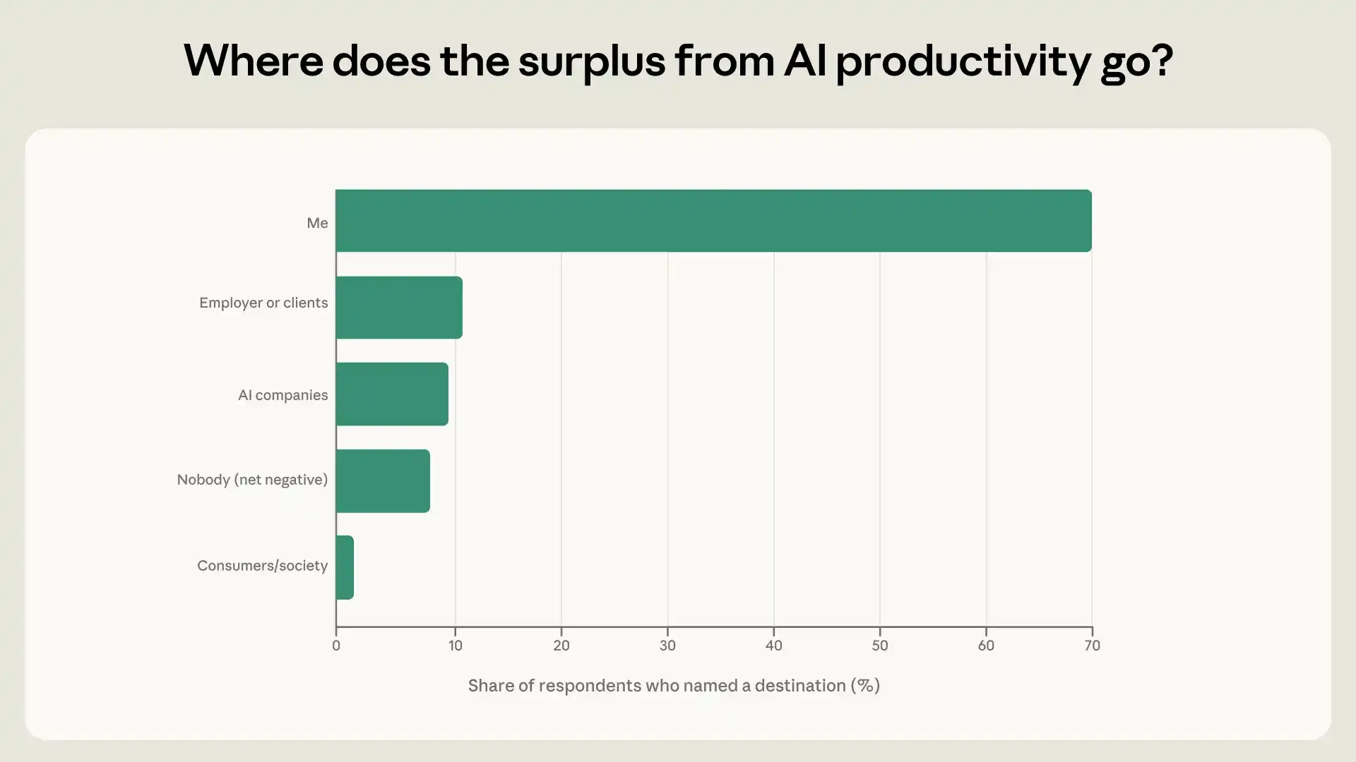 But an important limitation is that this survey targeted users with Claude personal accounts. A more representative picture would also include enterprise users, who might be more inclined to see value accruing to the employer.