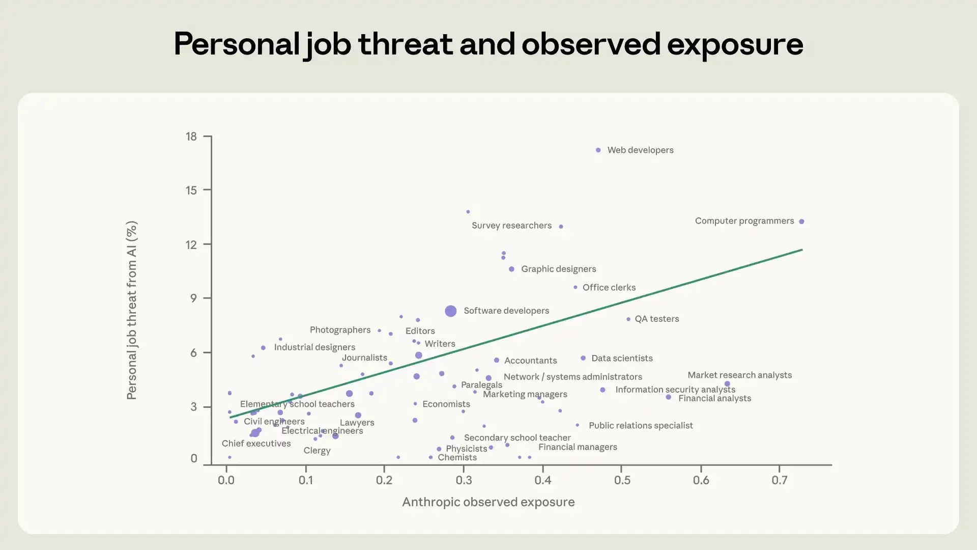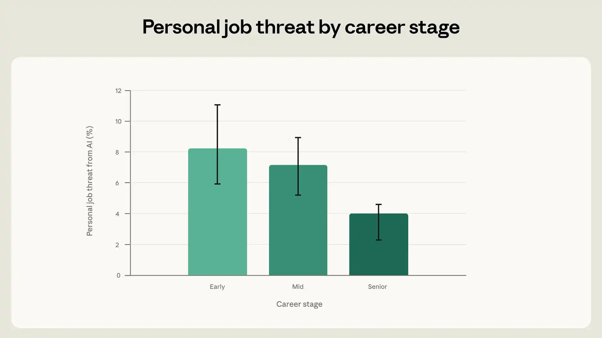 Our recent survey of 81,000 Claude users shows that people in jobs more easily replaceable by AI are more concerned about AI-induced unemployment. This is especially true for respondents in the early stages of their careers.