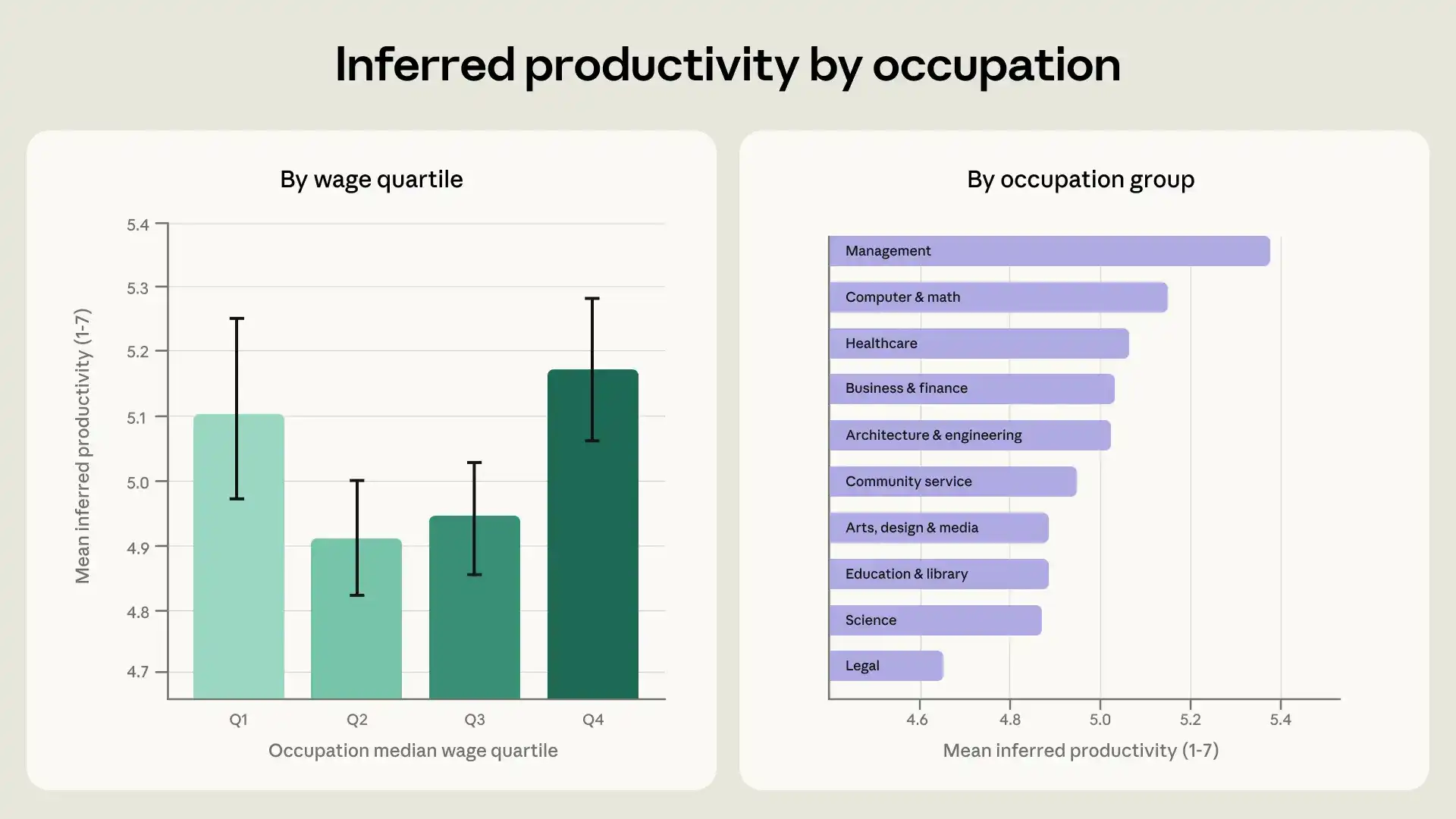 There are also signs that Claude empowers users. People were most likely to talk about gains flowing to themselves, rather than employers or AI companies. High-wage workers were most enthusiastic about AI's productivity effects, but people in low-wage jobs and with less education also reported substantial productivity gains. Most respondents reported Claude enhanced their capabilities in the form of expanding their work scope or speeding them up. But users experiencing the greatest speed boosts were also the most anxious about AI's job impact.