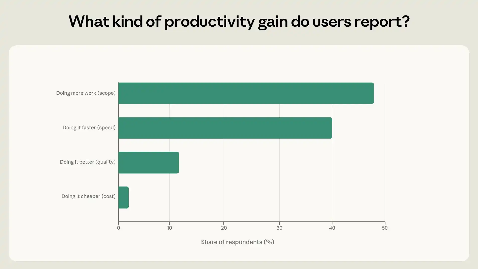 We found the most common productivity gain was in scope, mentioned by 48% of users who explicitly mentioned a productivity impact. 40% of users mentioning productivity highlighted speed.