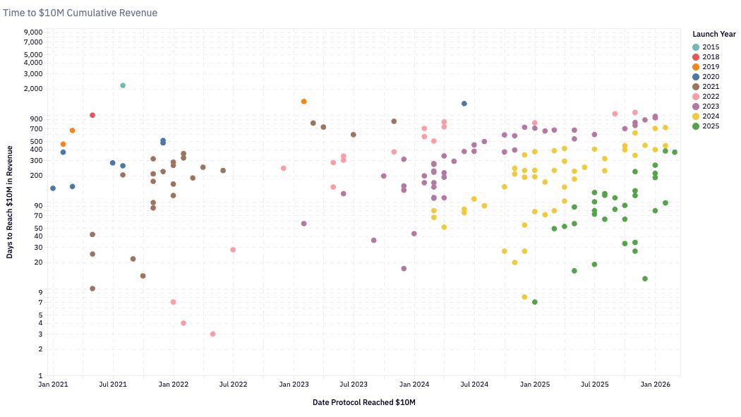 The number of teams with quarterly revenue exceeding $1 million has grown steadily since early 2020, now exceeding one hundred. In 2020, protocols that took 24 months to reach $10 million in annual revenue were considered fast-growing. By 2024, the time for protocols to reach this milestone had shortened to about six months. Pump.Fun launched in early 2024 and took about two months to reach $10 million in revenue, setting the fastest growth record.