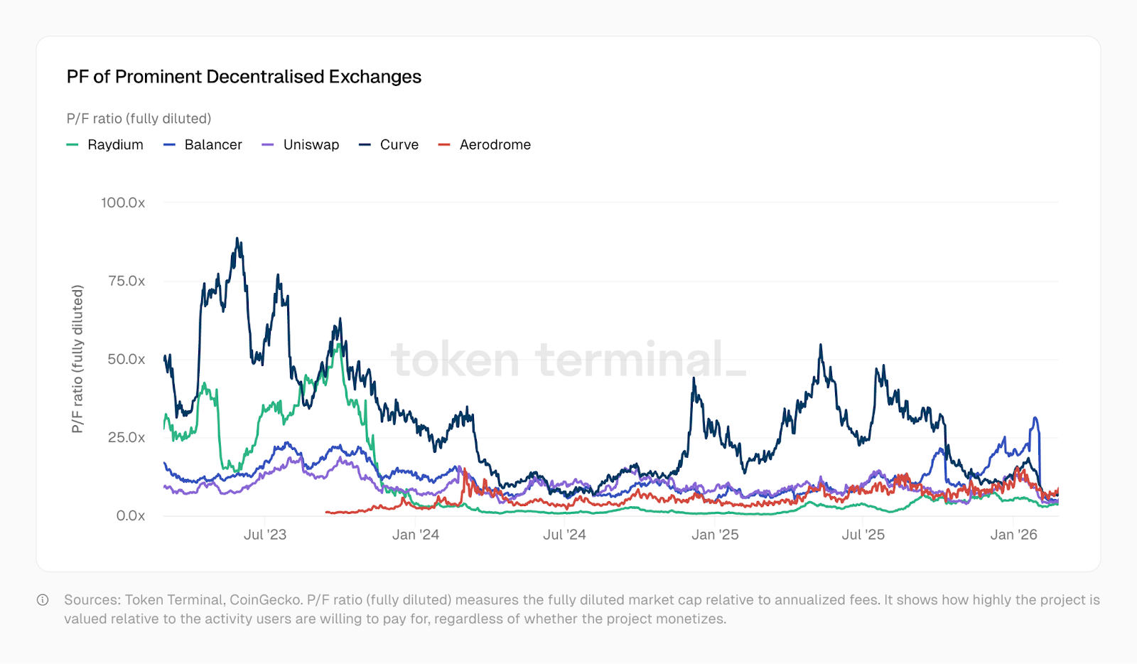 Take the fate of DeFi foundational projects as an example. Too many investor choices and a lack of novelty led to a plunge in valuations, even though these foundational projects did drive more economic activity. These markets are highly fragmented, and investors have numerous choices to bet on. The novelty of "decentralized" or "blockchain-based" has long faded. Projects like Kamino, Euler, Fluid, Meteora, and PumpSwap have emerged, but their price-to-fee ratios are lower than those of 2022 protocols. As shown in the TokenTerminal chart below, the price-to-fee multiples of DEXs fell sharply between 2023 and 2025. Some exchanges now have price-to-fee multiples as low as 1.