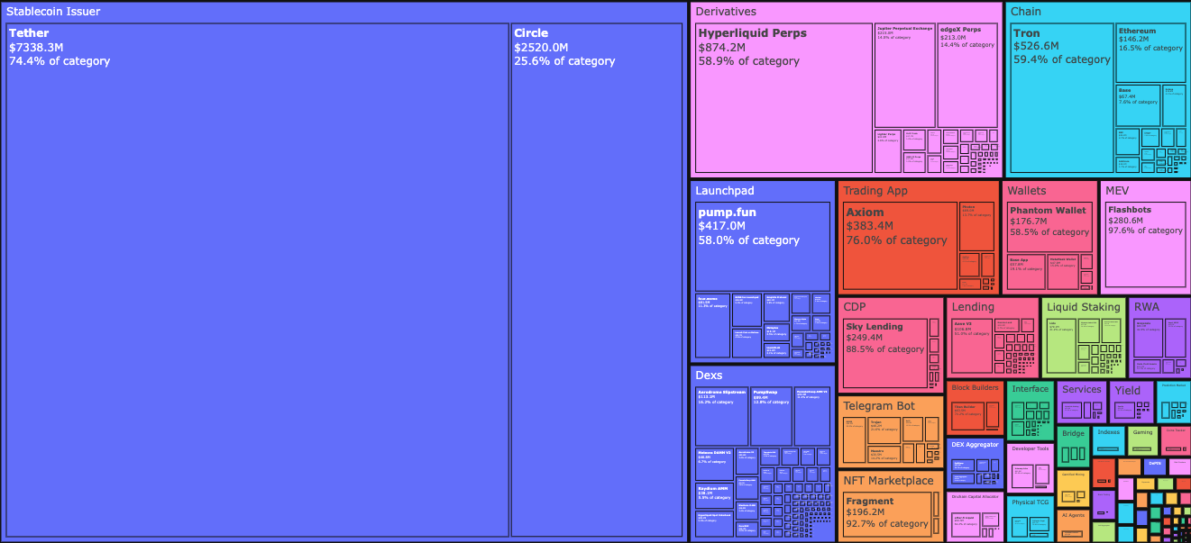 These two areas alone contributed $575 million in fees by January 2025. Given consumer demand, this is not hard to understand. Meme coin trading and perpetual contracts allow users to profit quickly. In pursuit of quick returns, they are willing to pay high fees. This category grew from 1% of total revenue in 2022 to just over 15% in 2025.