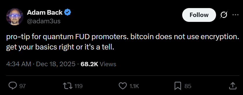 Others, including early Bitcoin figure Adam Back, have dismissed near-term quantum concerns as a form of fear, uncertainty and doubt, or FUD, arguing that Bitcoin does not rely on encryption for its core security model. Instead, Bitcoin uses digital signature schemes and cryptographic hash functions, which are not imminently threatened by practical quantum computers.