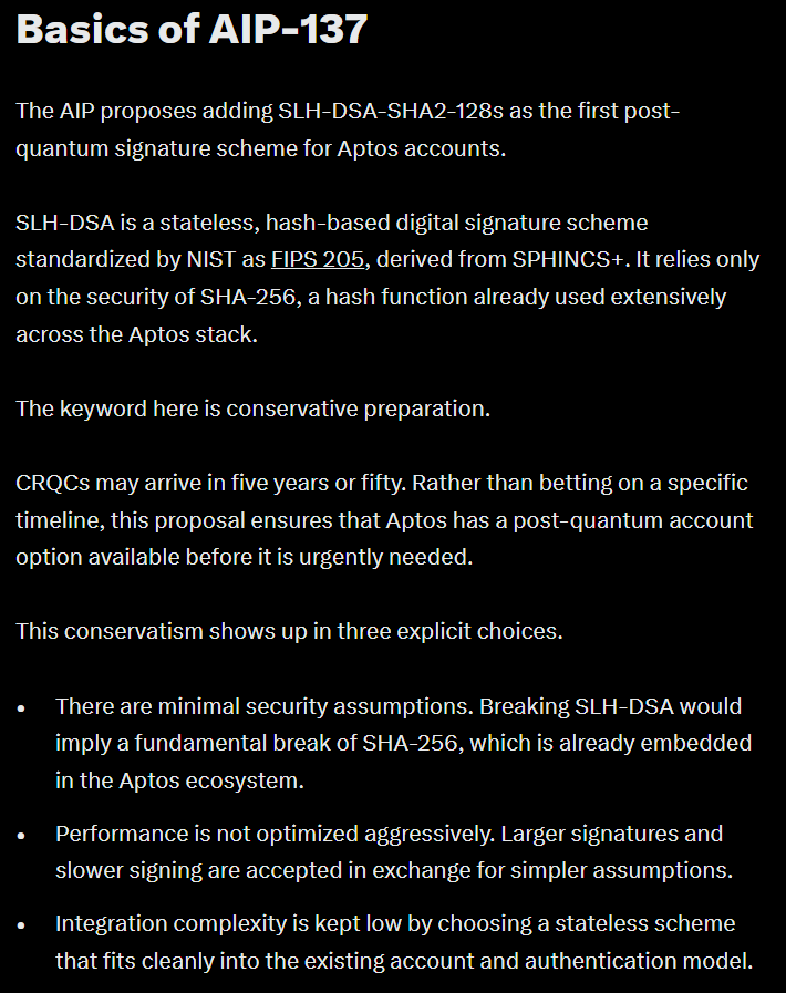 If approved through governance, AIP-137 would introduce SLH-DSA, a hash-based digital signature scheme standardized as FIPS 205, as an optional account signature type. The change would make Aptos one of the earliest production blockchains to natively support post-quantum accounts.