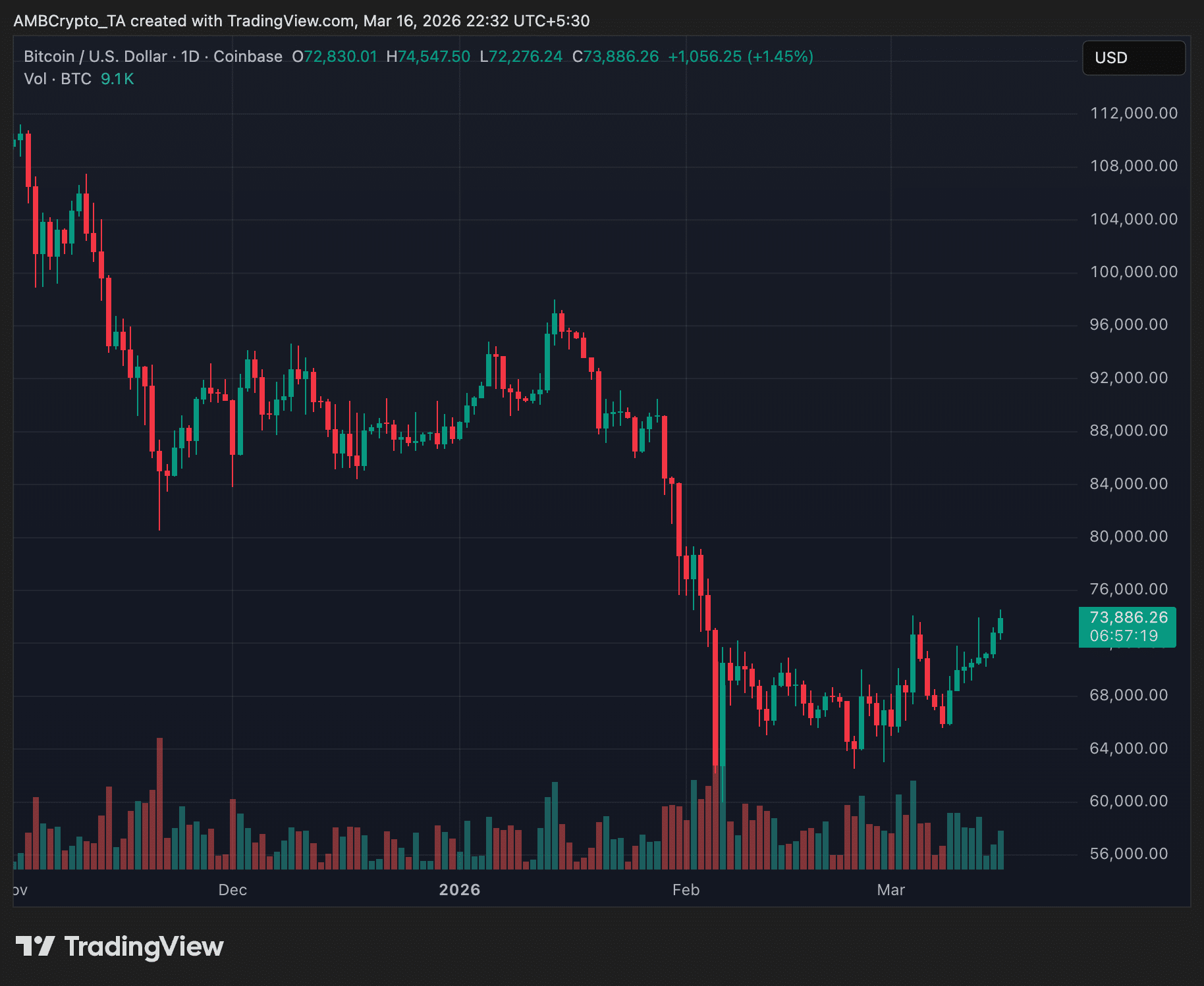 Technically, the $75,000 level also represents the upper boundary of Bitcoin’s nearly two-month consolidation range, making it a major psychological barrier for traders.