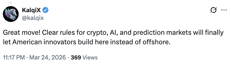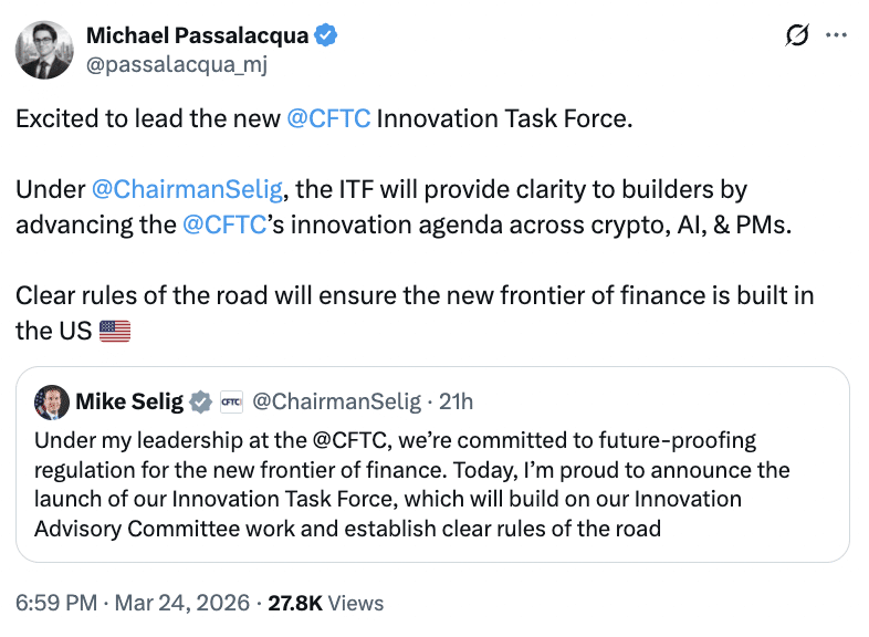 Now, that seems to be changing. On the 24th of March, CFTC Chairman Michael S. Selig launched an Innovation Task Force to create clear guidelines, especially for areas like crypto, AI systems, and prediction markets. The purpose of these rules is to facilitate businesses’ establishment and operations in the United States.