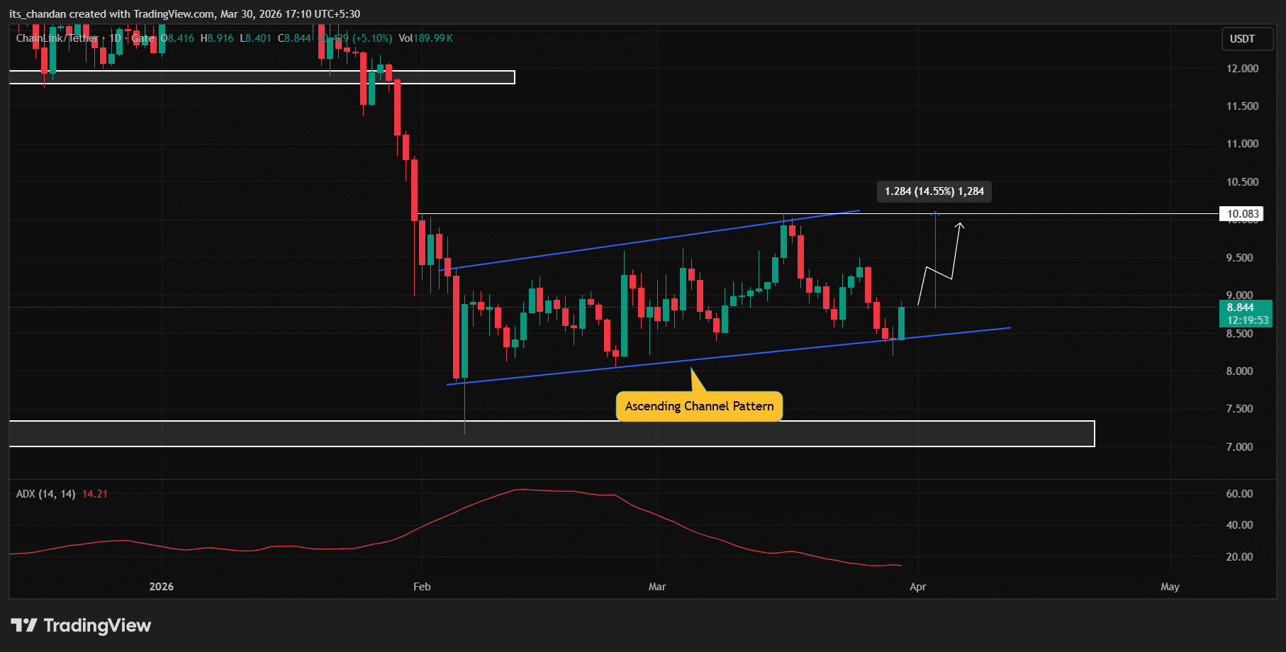- Chainlink has jumped 3.47%, increasing the chances of a price rebound as it is currently trading near the lower boundary of an ascending channel pattern.