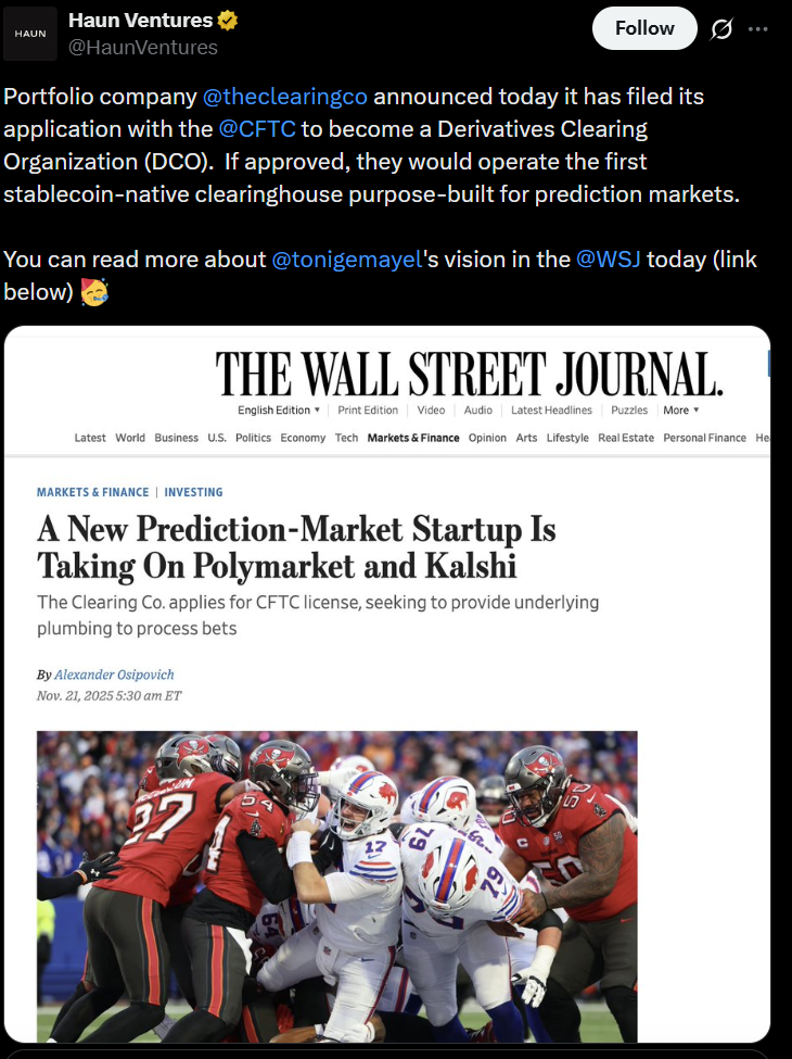 This momentum is unfolding alongside a shifting regulatory landscape. Last month, The Clearing Company applied with the US Commodity Futures Trading Commission to become a Derivatives Clearing Organization, in a step that could further integrate prediction markets into established financial frameworks.