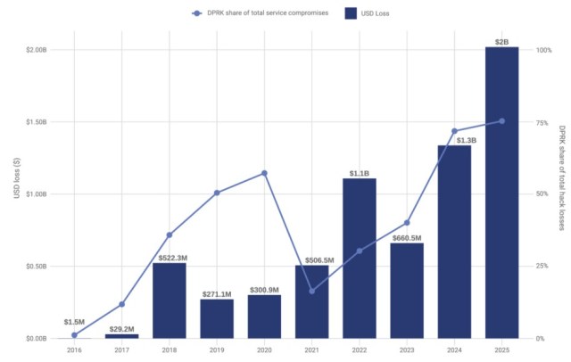 In 2025, North Korean hackers reportedly stole at least $2.02 billion in cryptocurrency, signifying a 51% increase from the previous year. This is the highest value ever recorded for DPRK-related crypto theft, with these attacks contributing to a record 76% of all service compromises.
