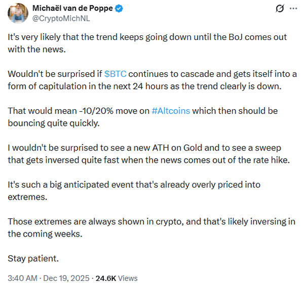 MN Fund co-founder Michaël van de Poppe predicted on Friday that more short-term pain is likely and the trend will continue downward until the Bank of Japan makes its decision on interest rates.