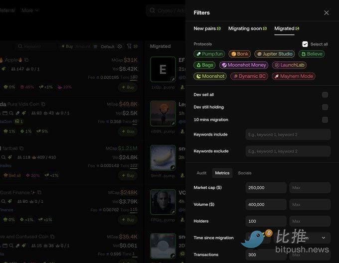 I always use the same set of filters because they save me the most time and effort. I'm only interested in tokens that have already shown real activity: – Solid trading volume (I usually set it to $400K or more) – A relatively reasonable market cap ($250K or more) – The token has confirmed migration from internal markets I don't look at projects before migration. From my experience, the time回报率 at that stage is too low. I'd rather put more capital into things that already exist and are running, rather than gamble on extremely low market caps.