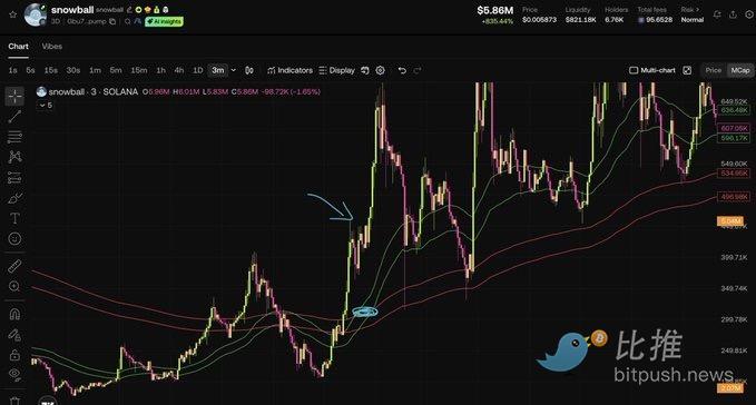 In practice, this means: the two green lines must cross above the red line and stably stay above it. Only after that will I consider: the market is starting to accept higher prices. In the SNOWBALL case, this signal gave an entry point around a $420K market cap. The market cap later exceeded $9M. I mentioned $3M earlier because this article continued the next day. Calculating from the "perfect entry," this was over 20x.