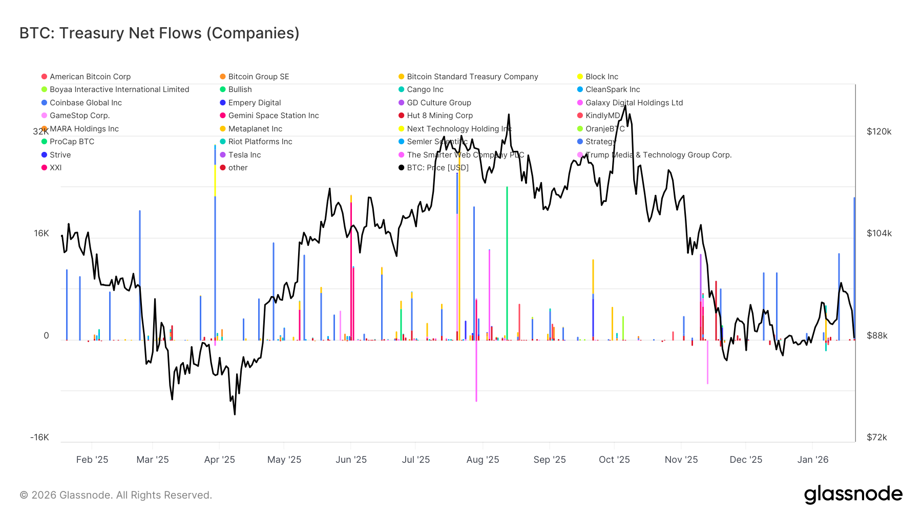 Recent corporate treasury net flows remain sporadic and uneven, with activity concentrated in isolated, event-driven transactions rather than broad-based accumulation. While several individual entities have posted notable inflow spikes over the past few weeks, aggregate corporate demand has not yet transitioned into a sustained accumulation regime.
