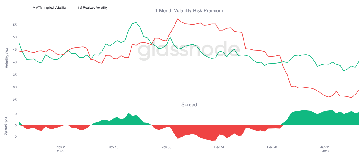 This dynamic reinforces volatility compression. As long as selling volatility remains profitable, more participants are willing to engage, keeping implied volatility anchored. As of January 20, the one-month volatility spread stood around 11.5 volatility points in favor of sellers, highlighting how supportive current conditions remain for volatility selling behavior.