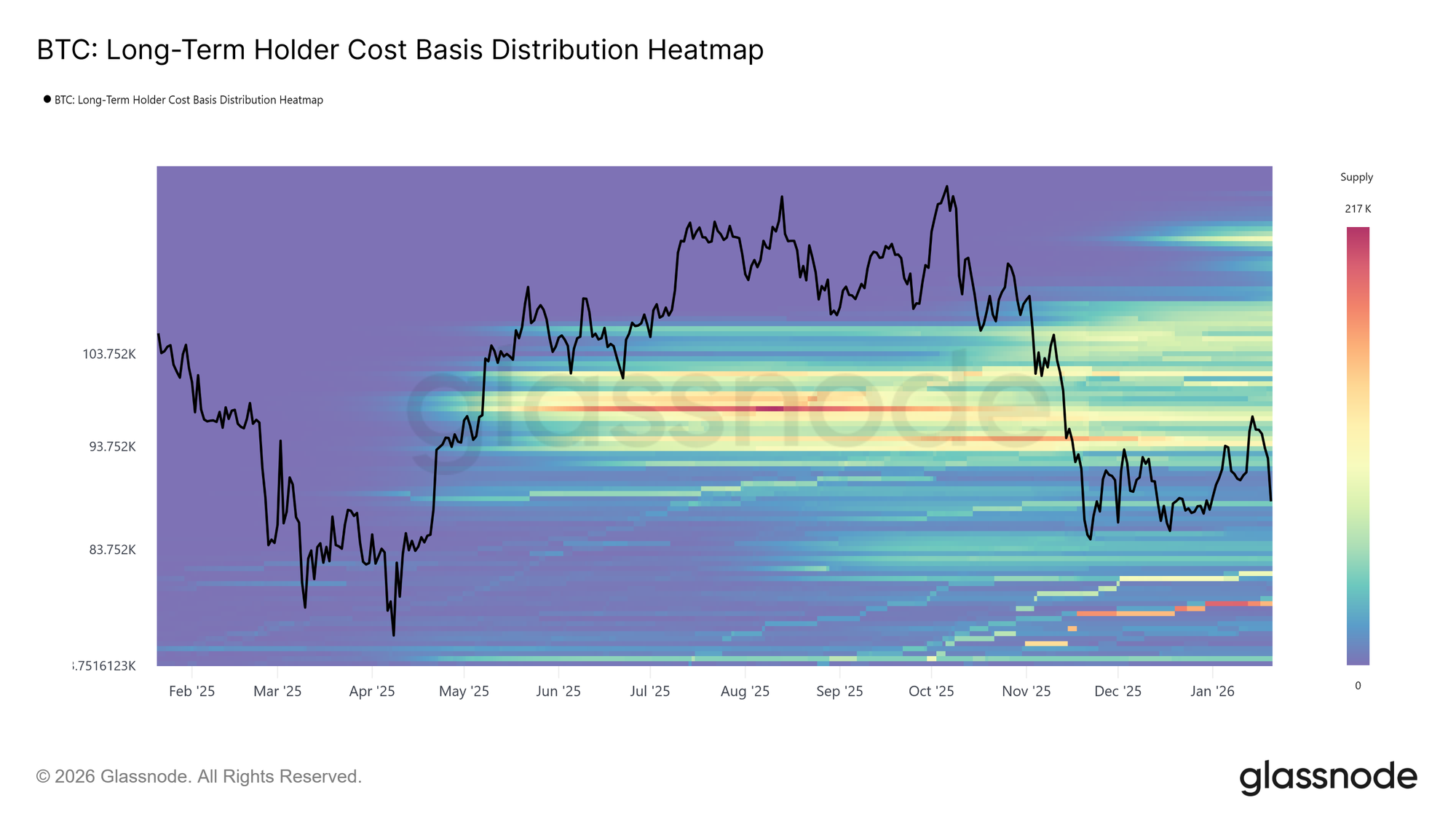 The Long-Term Holder Cost Basis Distribution Heatmap, which maps long-term holder supply by acquisition price, highlights a dense concentration of coins held above the current spot level. This cluster represents a substantial pool of potential sell-side liquidity, particularly in the short to mid term, as price approaches prior entry levels.