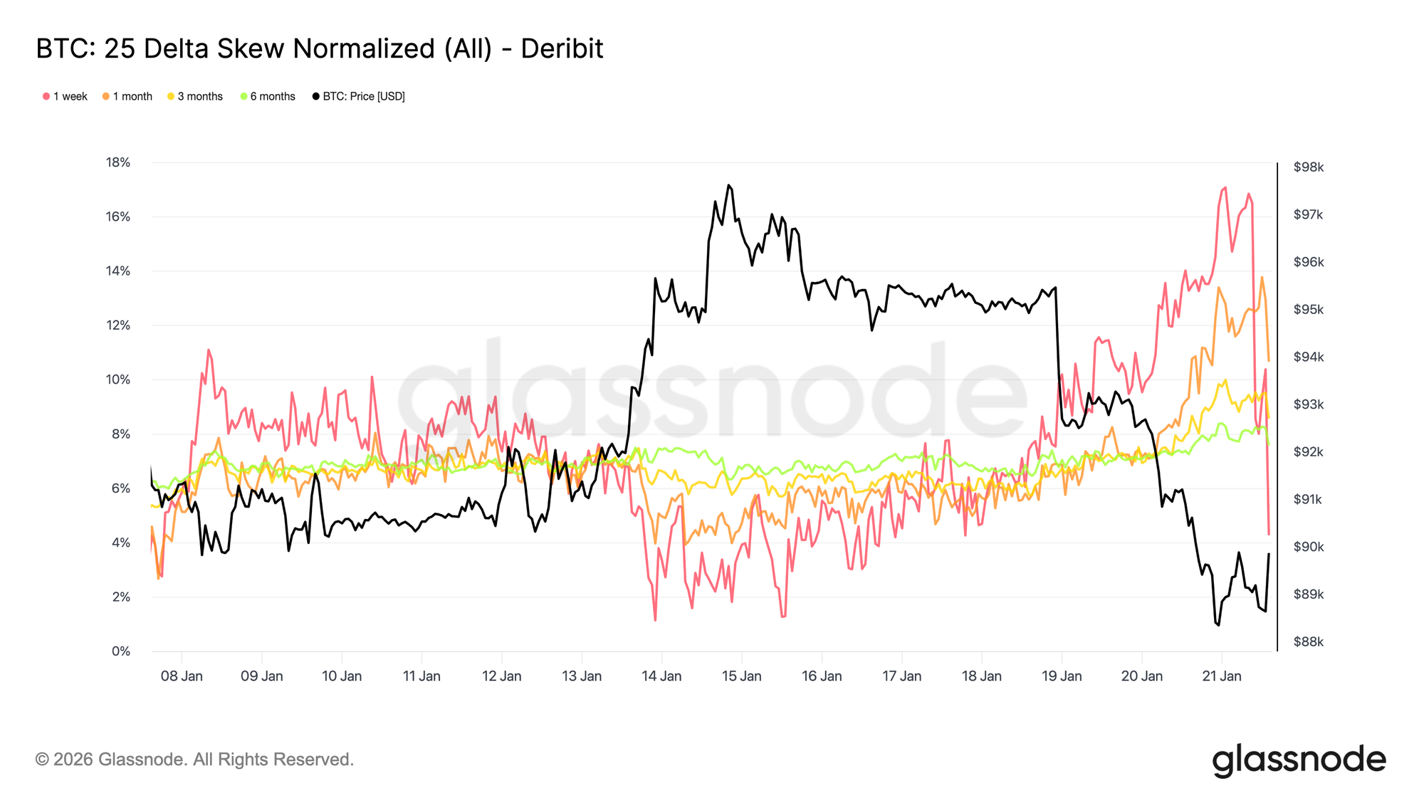 When skew tilts this aggressively, it often coincides with local extremes, where positioning becomes crowded and the market struggles to extend in the same direction. Following the Trump discourse at Davos, downside richness has been faded and monetized, and skew has started to revert, almost as quickly as it moved higher.