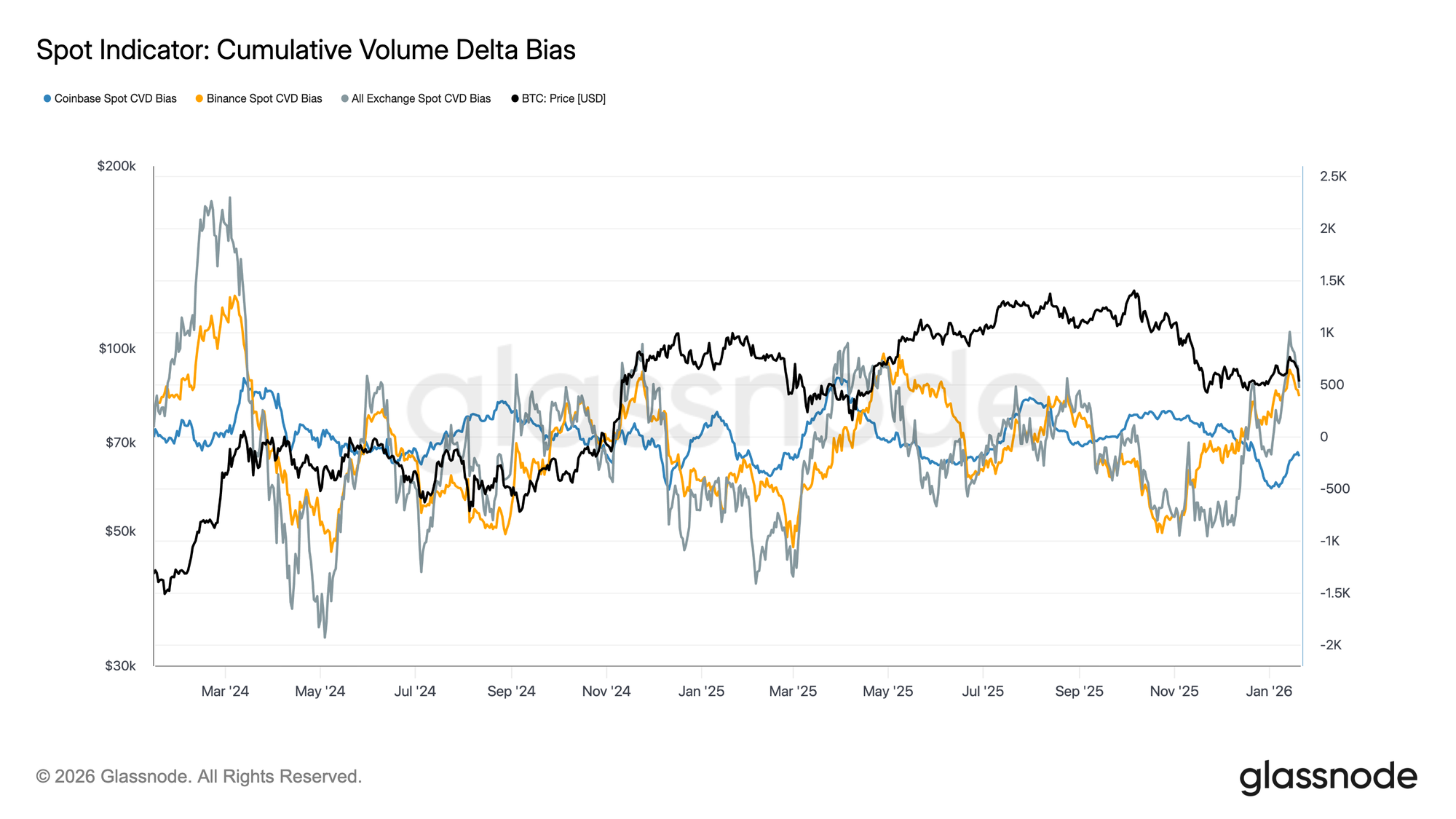 Spot market behaviour has begun to improve following the recent drawdown, with Binance and aggregate exchange CVD measures rotating back toward a buy-dominant regime. This marks a shift away from the persistent sell-side pressure that defined the prior consolidation, indicating that spot participants are once again absorbing supply rather than distributing into strength.