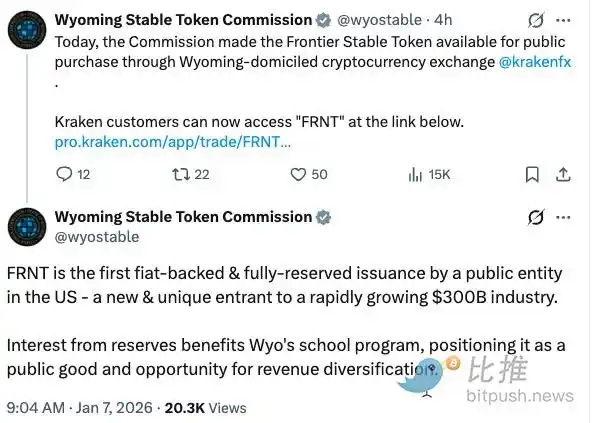 On January 7, local time, the state officially announced the launch of the $FRNT stablecoin, initially released on the Solana blockchain and supporting six EVM-compatible chains. This is the world's first dollar stablecoin backed by "state government credit."