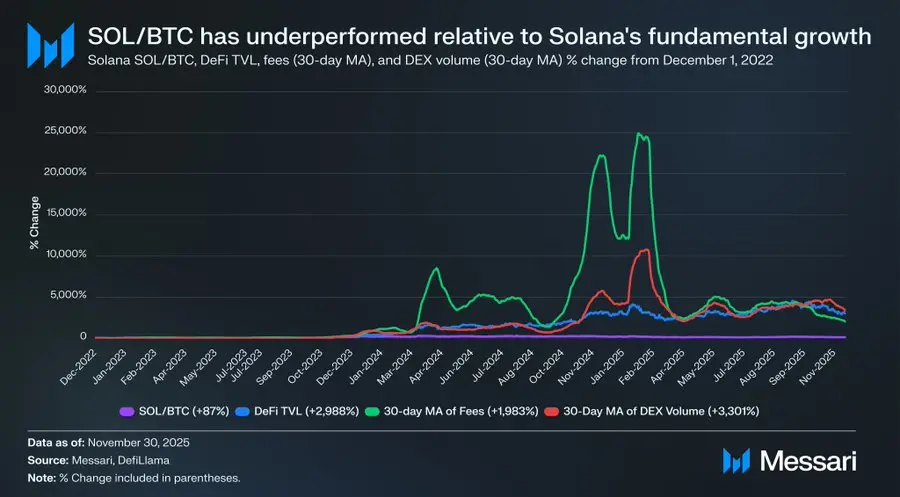 But upon closer examination, SOL's "outperformance" may not be as strong as it appears. During the same period that SOL outperformed BTC by 87%, Solana's fundamentals experienced exponential growth: DeFi TVL increased by 2,988%, fees grew by 1,983%, and DEX trading volume surged by 3,301%. By any reasonable measure, the Solana ecosystem expanded by 20 to 30 times since the end of 2022, yet SOL's price only outperformed BTC by 87%.