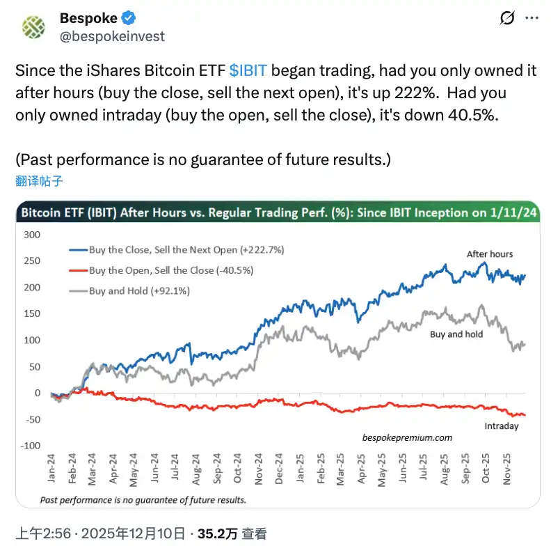 For example, a very interesting point is that Bitcoin's performance during U.S. trading hours was relatively weaker. Data from Bespoke Investment stated: "Since BlackRock's IBIT Bitcoin ETF began trading, holding it after hours yielded 222%, but holding it only during market hours resulted in a 40.5% loss."