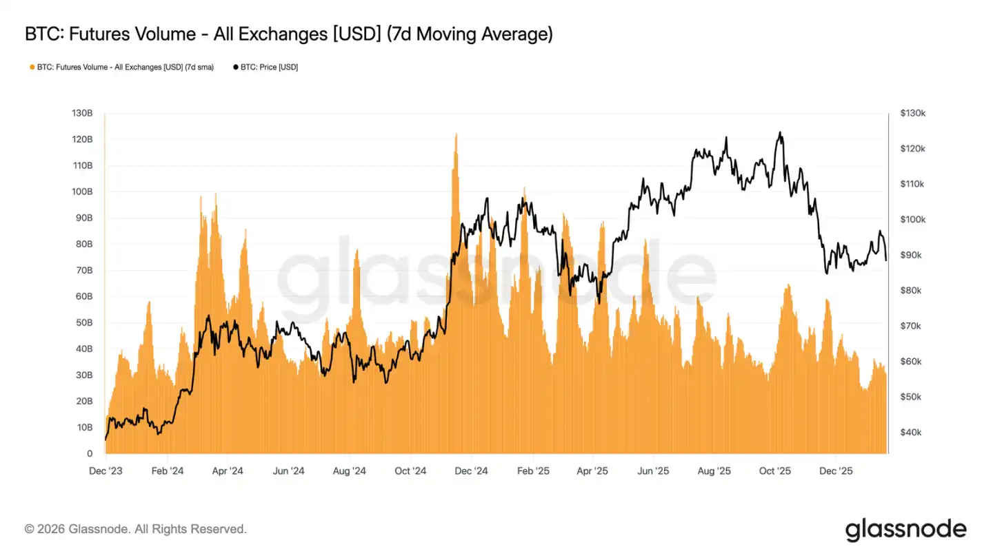 Bitcoin futures' 7-day moving average volume continues to contract, remaining well below levels typically associated with trending markets. The recent price volatility has not been accompanied by a meaningful expansion in volume, highlighting the low participation and lack of confidence in the derivatives market.