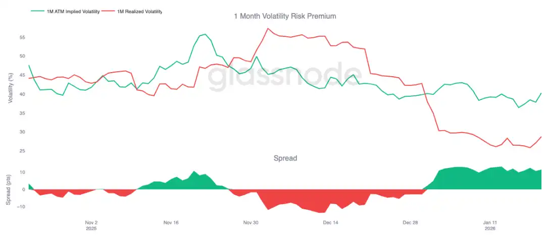 This dynamic is self-reinforcing, suppressing volatility. As long as selling volatility is profitable, more participants will join, keeping implied vol suppressed. As of Jan 20, the 1-month vol spread sits at ~11.5 volatility points in favor of sellers, which speaks volumes about the continued friendliness of the environment for selling volatility.