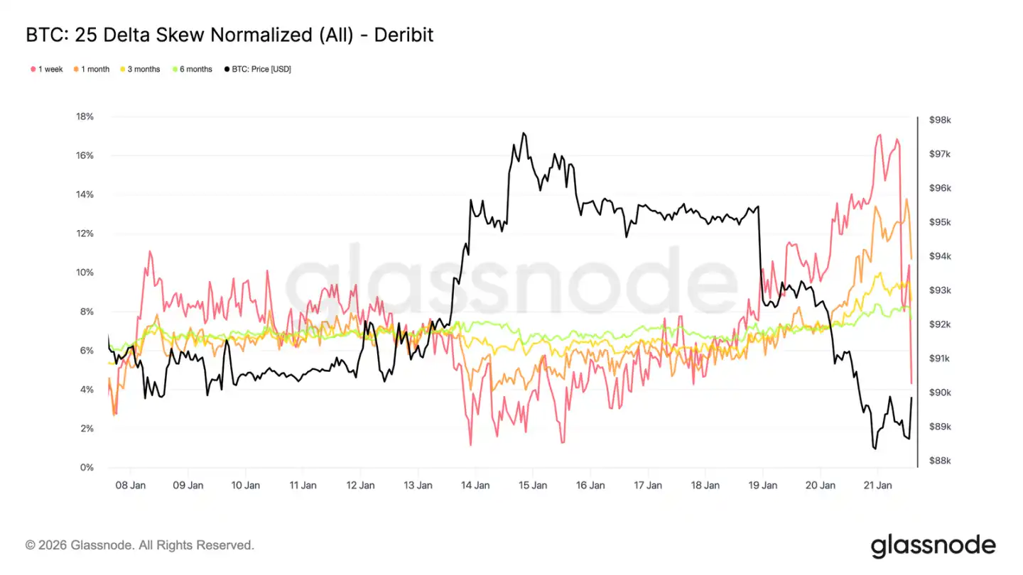 Similar to at-the-money volatility, short-dated skew also dominated this adjustment. The 1-week 25 Delta skew, which was near equilibrium a week ago, has sharply pivoted to a 'puts richer' state.