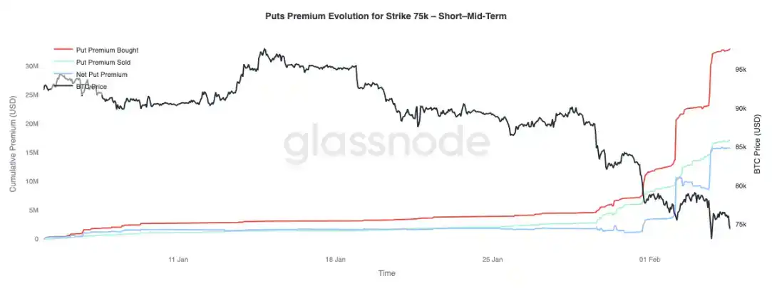 The $75,000 strike put option has become a focal point for the market, as this level has been tested repeatedly. The net buying premium for these puts has increased significantly, a process advancing in three stages, each synchronized with price declines lacking effective rebound.